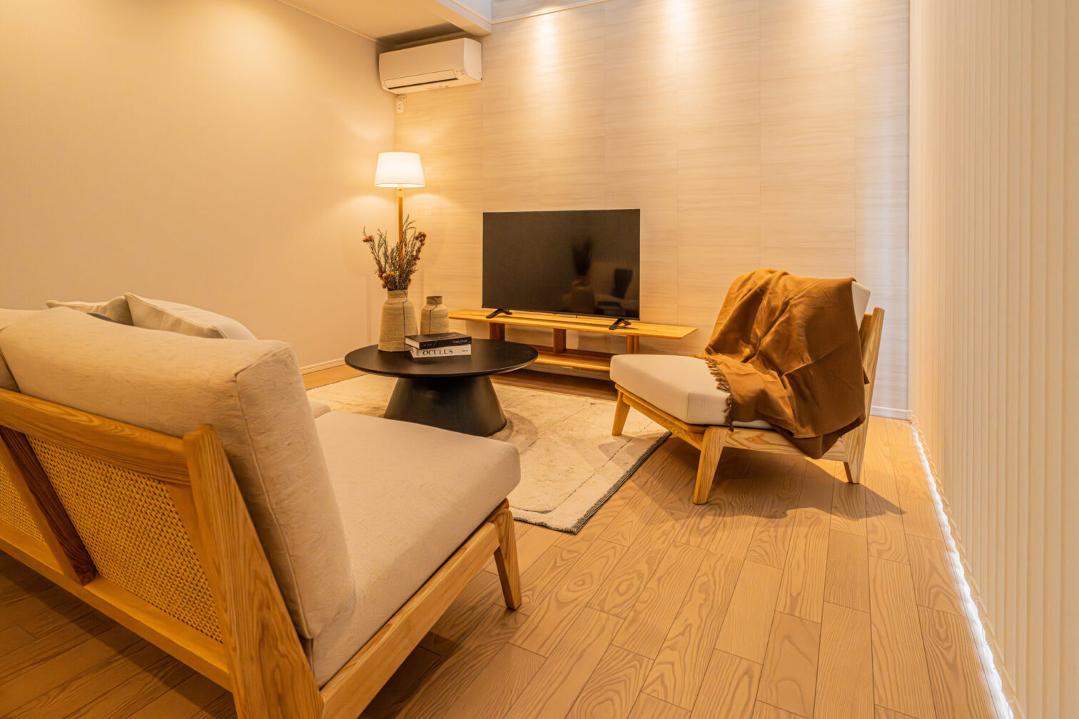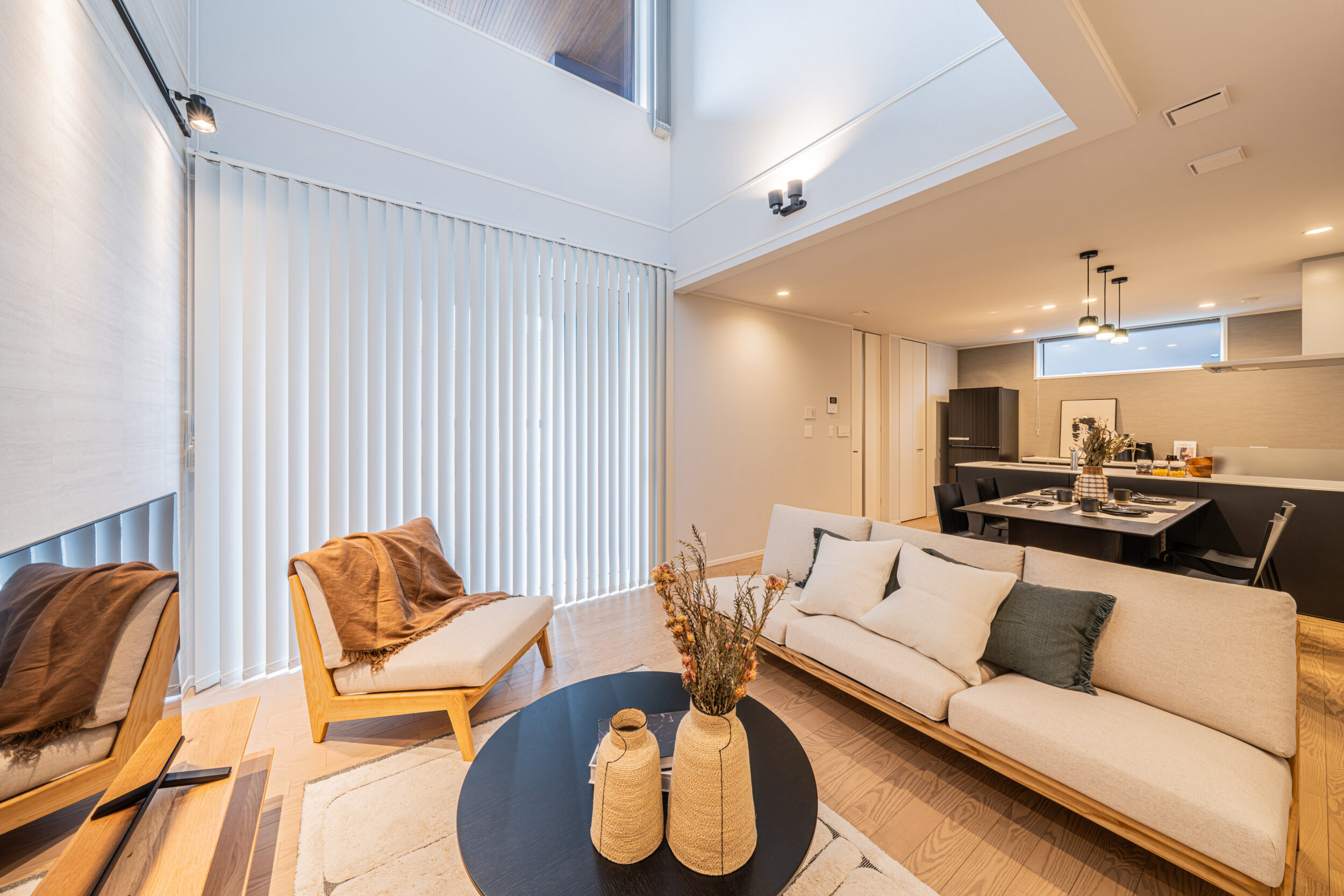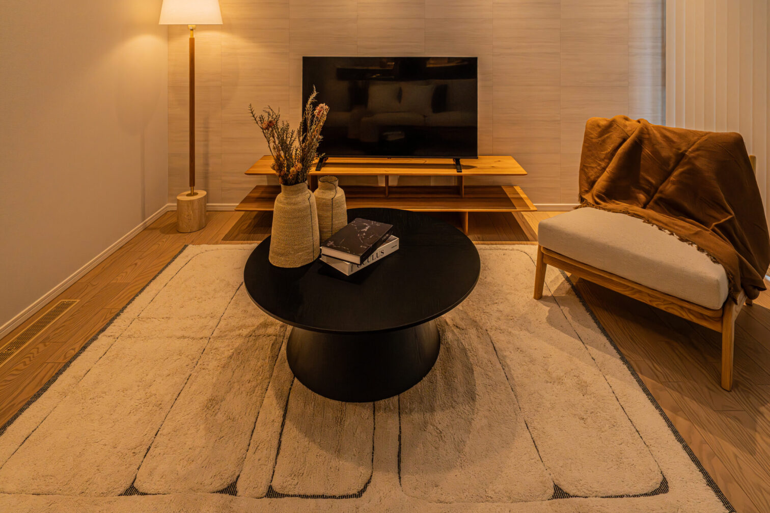 柔らかい印象を与える形状の家具と木の優しく暖かい雰囲気を感じる北欧スタイルと和の要素をミックスさせたトレンドスタイルであるジャパンディスタイル。そこにモノトーンの要素を追加したモダンジャンパンディスタイルをご提案いたします。家具の基本形状はラウンド形状で固め、ファブリックは明るいオフホワイトをメインに所々ブラックを入れることで締まりのある空間を演出します。またブラックと木、オフホワイトが混ざることで空間の”侘び寂び”や”静と動”を感じられるモデルとなります。