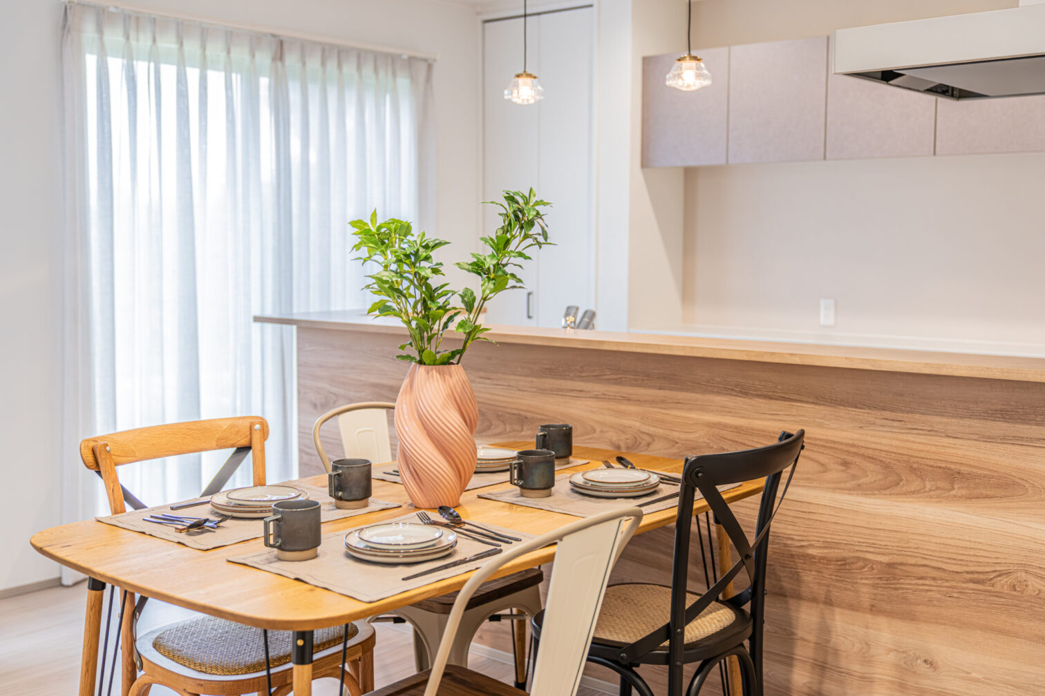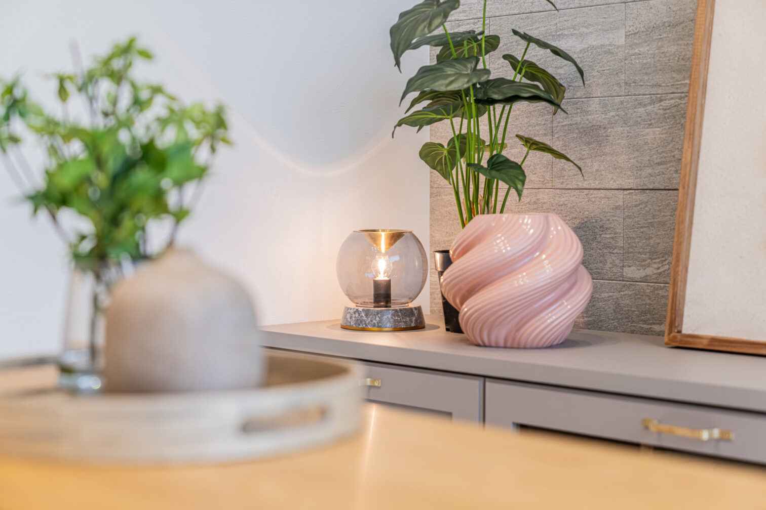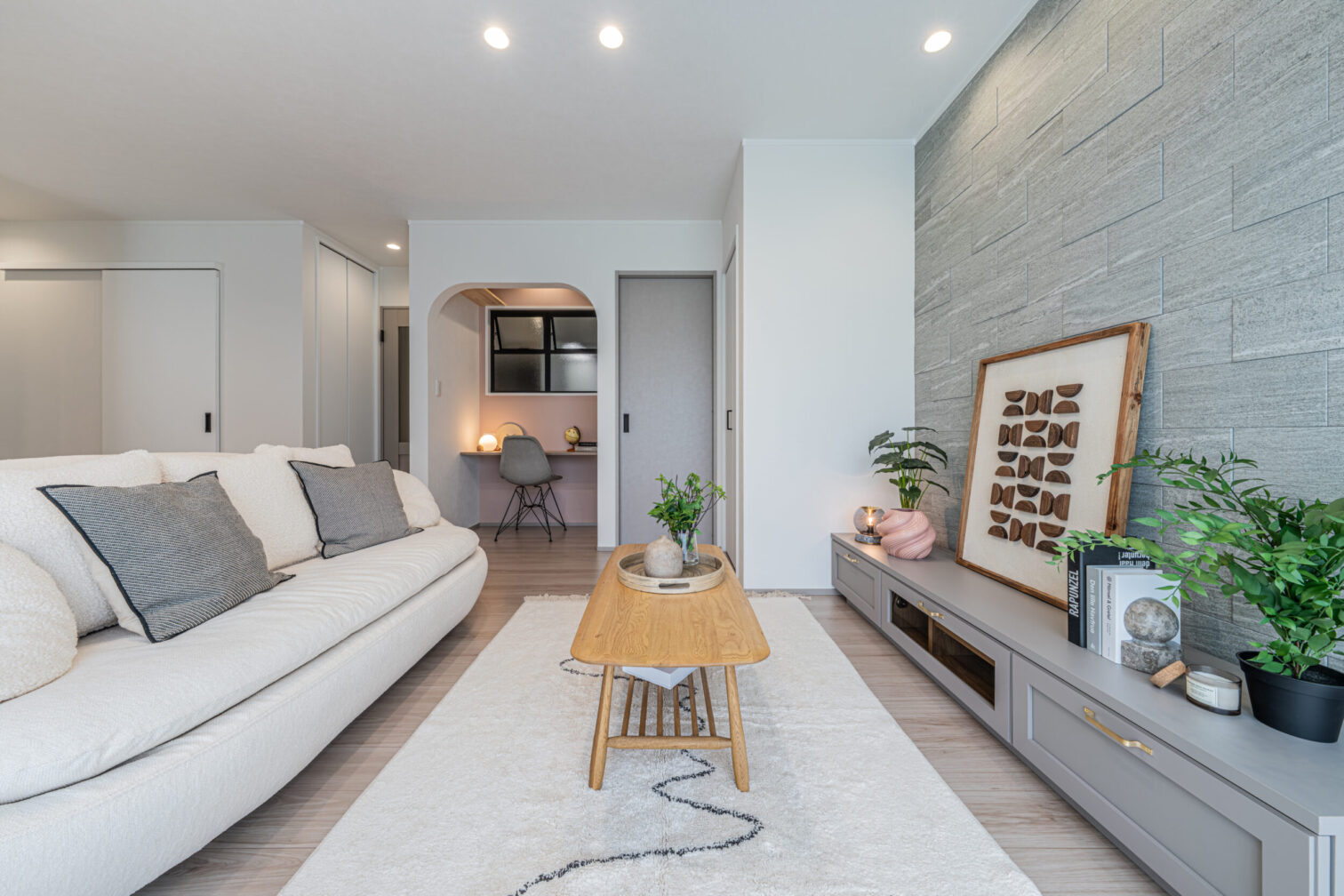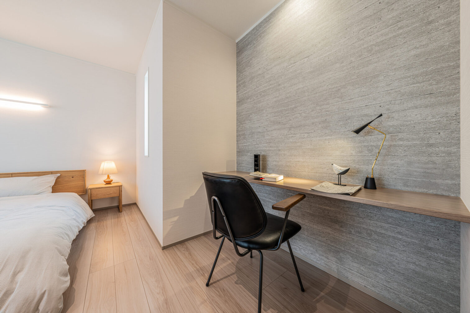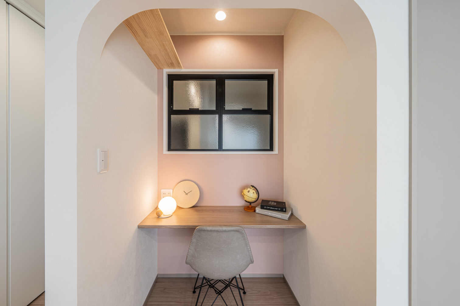 日々の生活を充実してもらうための空間作りを想定して家具をチョイスしました。少しモダンよりな内装ですが、そこをフレンチインテリア要素として捉え他空間作りをしており、ワークスペースのピンクのアクセントクロスを活かした家具の選定も行っております。